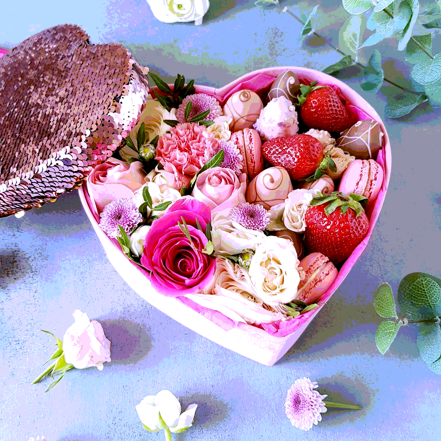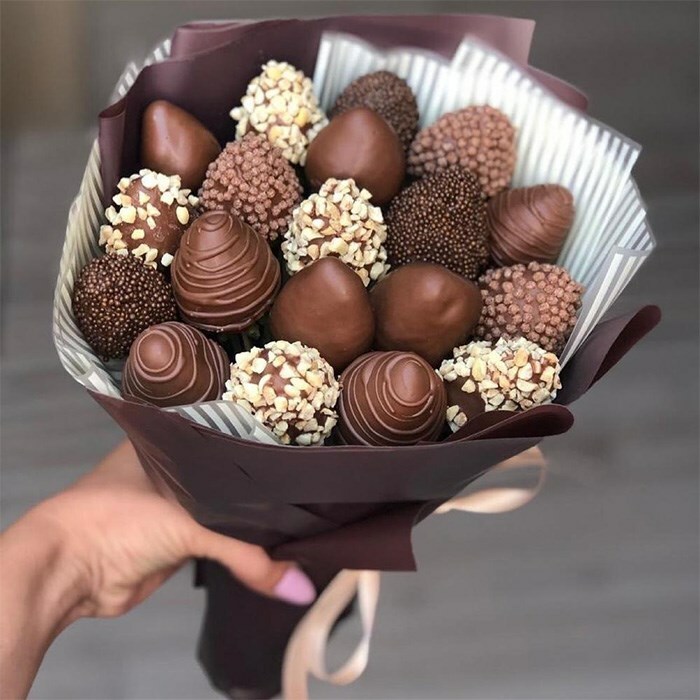 Букет не рекомендуется трясти и переворачивать – лучше держать его вертикально. Рекомендуем съесть ягоды сразу или, сняв их со шпажек, убрать в холодильник